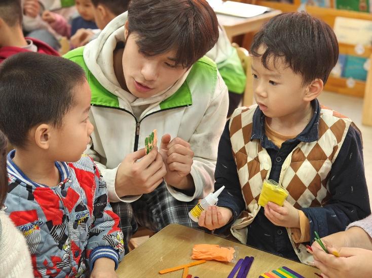 活动中,志愿者们通过温室农业主题视频、实景照片及PPT,以通俗易懂的语言向孩子们讲解农业知识与木屋建筑基础结构、搭建原理,并以童趣提问引导孩子们主动思考。创意手工环节,志愿者展示雪糕棒、五彩太空泥等材料及成品温室小木屋,结合幼儿动手能力特点耐心示范拼接固定、塑形等关键步骤,手把手指导孩子们发挥想象,将普通材料打造成独一无二的温室小木屋,活动室里充满欢声笑语。