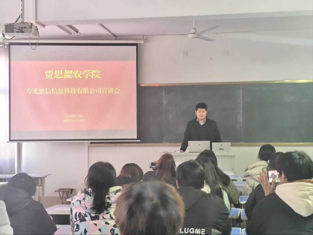 2025年12月25日,贾思勰农学院于328教室举办企业专场宣讲会,聚焦学子职业发展需求,助力提前洞悉职场方向、科学规划职业路径。山东禾宜生物科技有限公司、山东亿嘉集团、寿光芝麻出门农业数据科技有限公司、寿光恩信信息科技有限公司四家农业行业骨干企业应邀参会,为在校学生搭建起对接优质岗位的便捷桥梁。